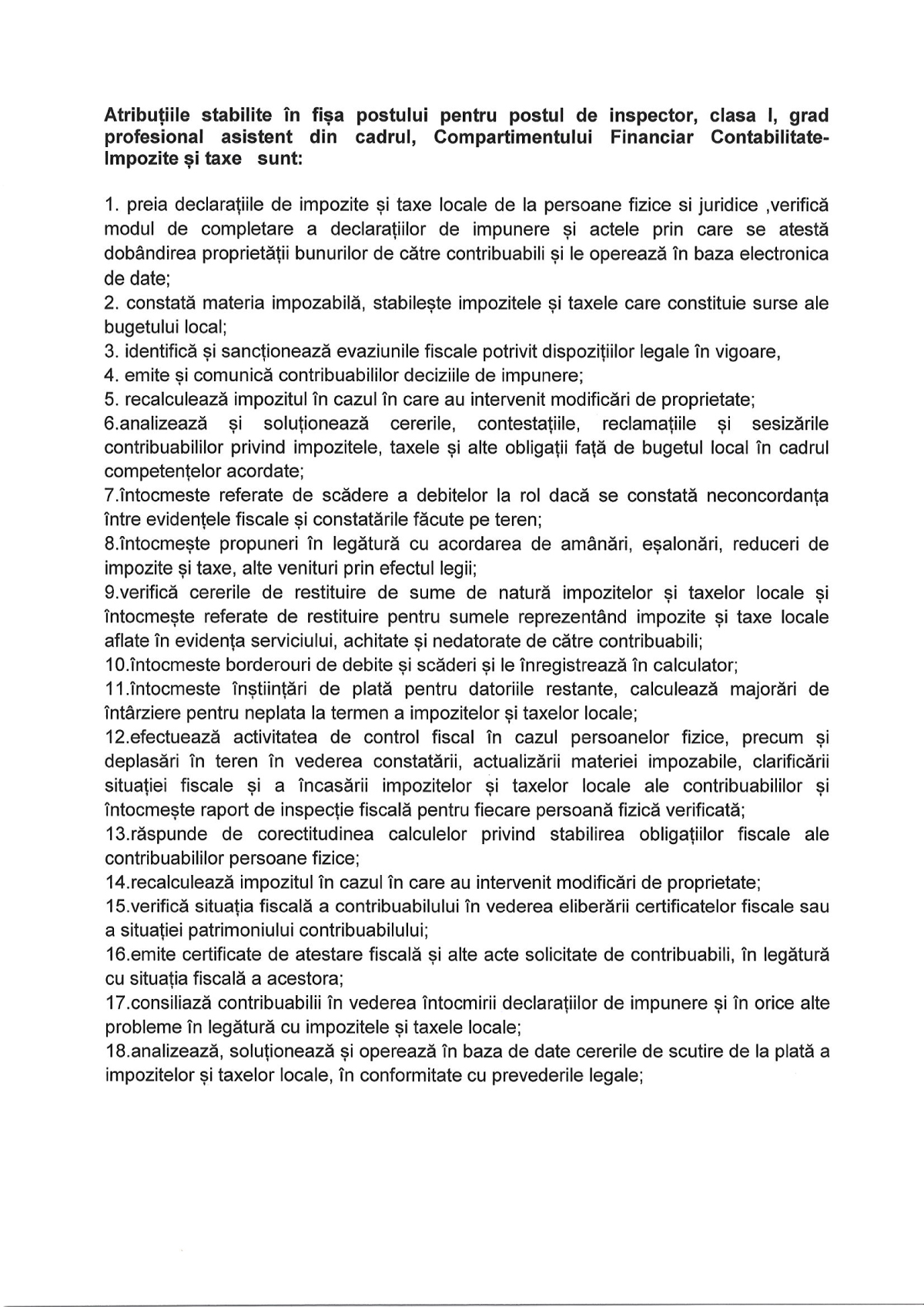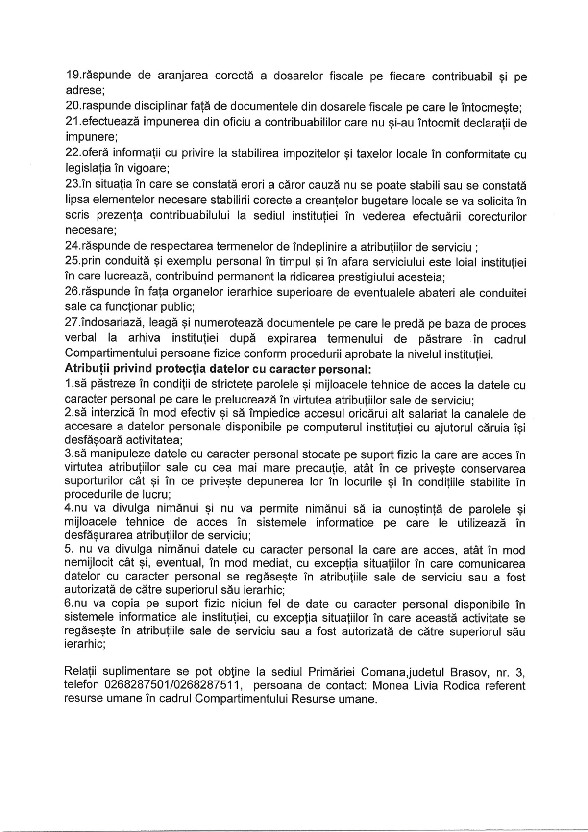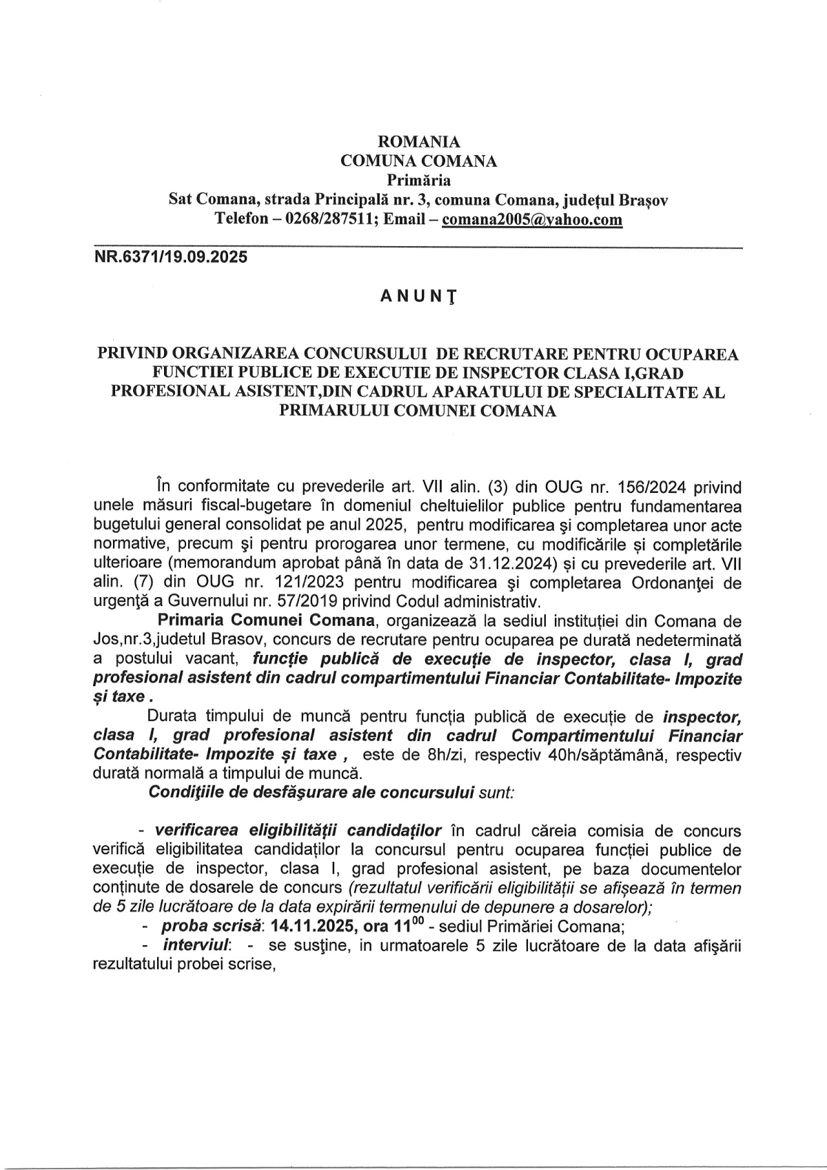 Primaria Comunei Comana, organizeaza la sediul institutiei din Comana de Jos,nr.3,judetul Brasov, concurs de recrutare pentru ocuparea pe durata nedeterminata a postului vacant, functie publica de executie de inspector, clasa 1, grad profesional asistent din cadrul compartimentului Financiar Contabilitate – Impozite Si taxe.