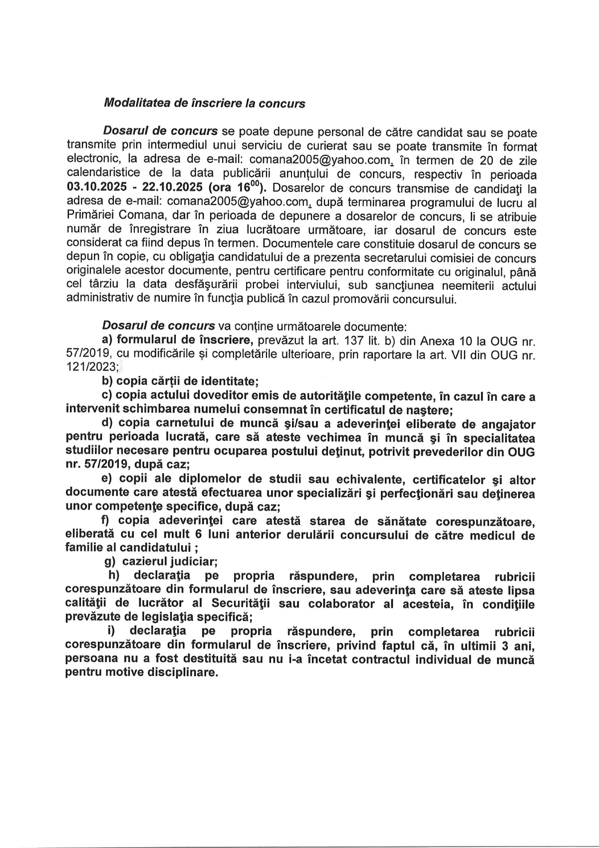 Dosarul de concurs se poate depune personal de catre candidat sau se poate transmite prin intermediul unui serviciu de curierat sau se poate transmite in format electronic, la adresa de e-mail: comana2005@yahoo.com, in termen de 20 de zile calendaristice de la data publicdrii anuntului de concurs, respectiv in perioada 03.10.2025 – 22.10.2025 (ora 16). Dosarelor de concurs transmise de candidati la adresa de e-mail: comana2005@yahoo.com, dupa terminarea programului de lucru al Primariei Comana, dar in perioada de depunere a dosarelor de concurs, li se atribuie numar de inregistrare in ziua lucratoare urmatoare, iar dosarul de concurs este considerat ca fiind depus in termen. Documentele care constituie dosarul de concurs se depun in copie, cu obligatia candidatului de a prezenta secretarului comisiei de concurs originalele acestor documente, pentru certificare pentru conformitate cu originalul, pana cel tarziu la data desfasurarii probei interviului, sub sanctiunea neemiterii actului administrativ de numire in functia publica in cazul promovarii concursului.