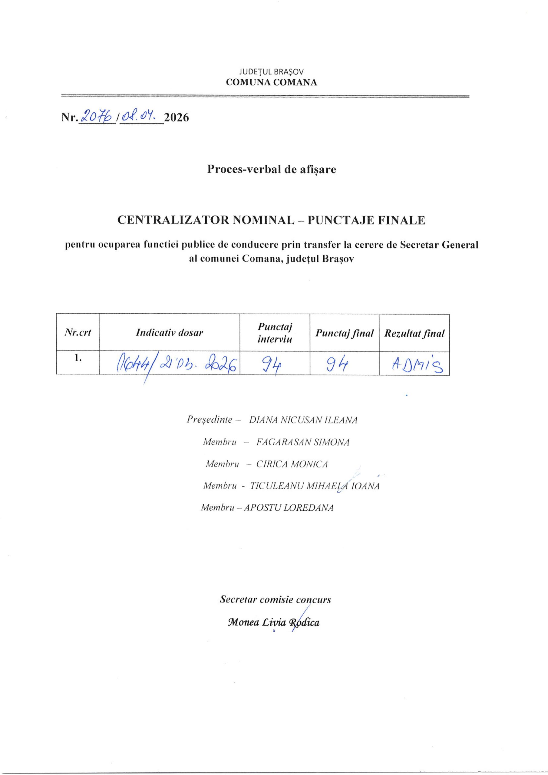 ANUNȚ – Privind rezultatul examinării dosarului din data de 08.04.2026 pentru ocuparea prin transfer la cerere a unei funcții publice de conducere de Secretar General al unității administrativ teritoriale din cadrul aparatului de specialitate al primarului comunei Comăna, județul Brașov