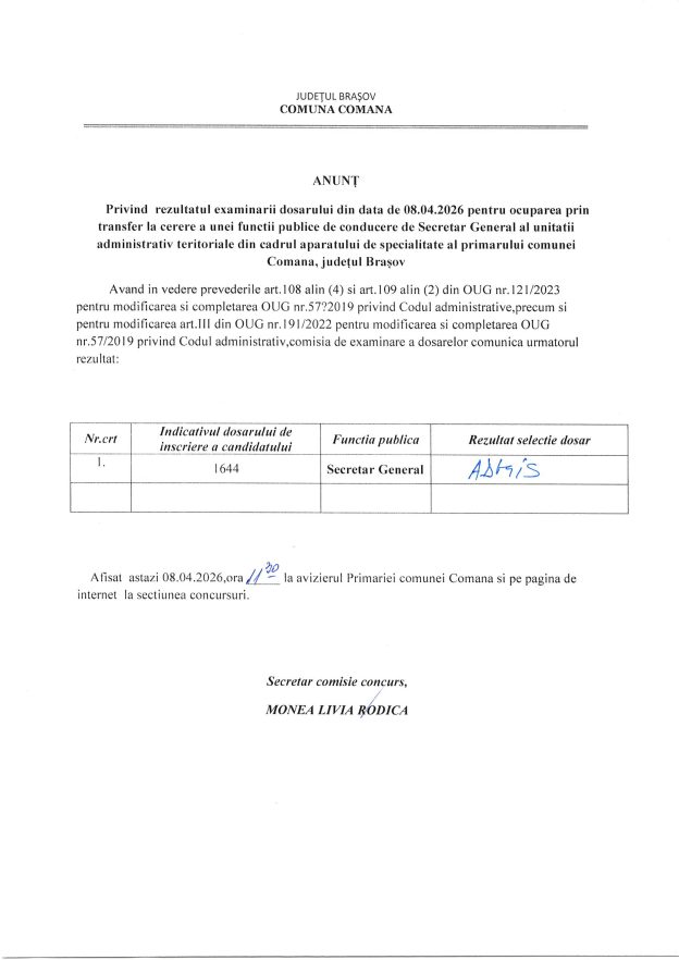 ANUNȚ – Privind rezultatul examinării dosarului din data de 08.04.2026 pentru ocuparea prin transfer la cerere a unei funcții publice de conducere de Secretar General al unității administrativ teritoriale din cadrul aparatului de specialitate al primarului comunei Comăna, județul Brașov