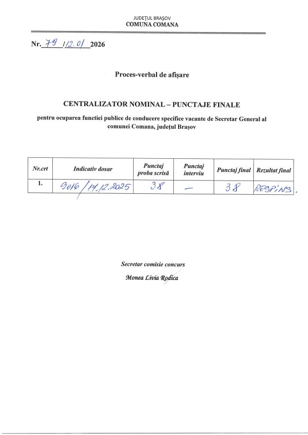 Proces-verbal de afisare – CENTRALIZATOR NOMINAL — PUNCTAJE FINALE pentru ocuparea functiei publice de executie specifice vacante de referent clasa III, grad profesional superior la compartimentul Registru Agricol, din cadrul aparatului de specialitate al Primarului Comunei Comdana, judetul Brasov.