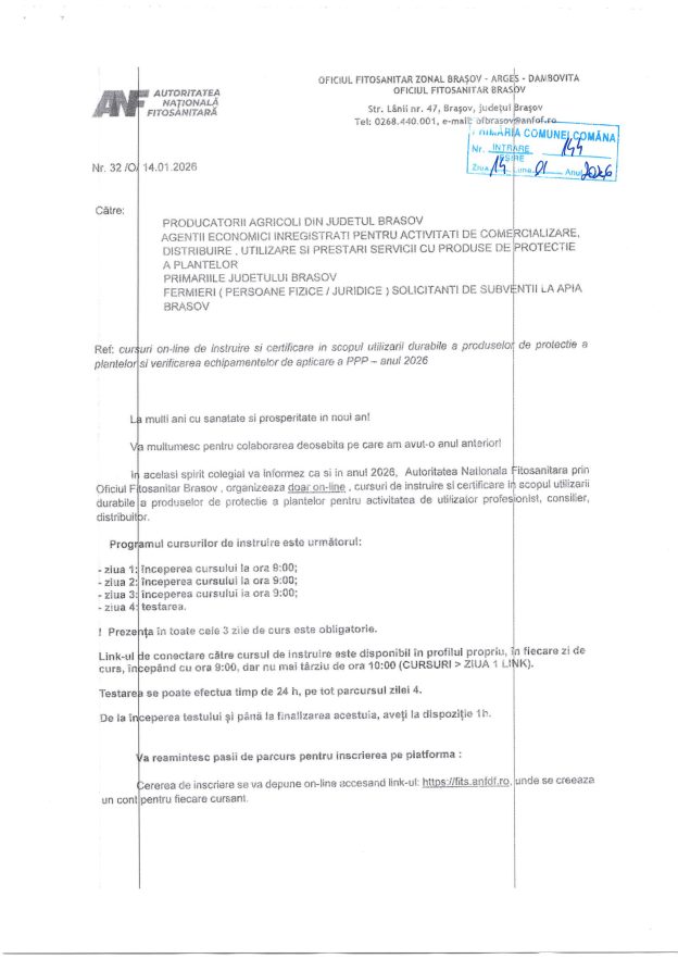 Informare: în anul 2026, Autoritatea Națională Fitosanitară prin Oficiul Fitosanitar Brașov, organizează doar on-line , cursuri de instruire și certificare în scopul utilizării durabile a produselor de protecție a plantelor pentru activitatea de utilizator profesionist, consilier, distribuitor.