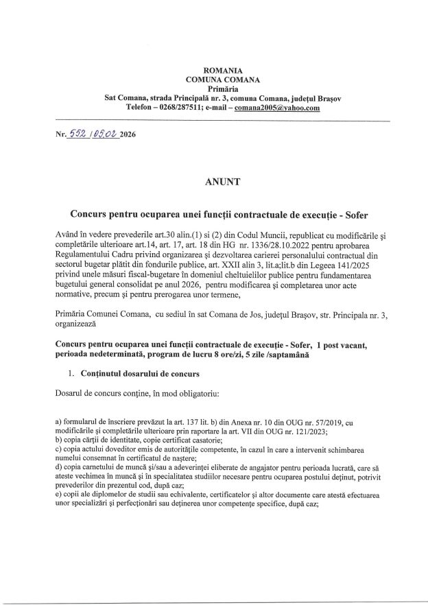 Primaria Comunei Comana, cu sediul in sat Comana de Jos, judetul Brasov, str. Principala nr. 3, organizeaza