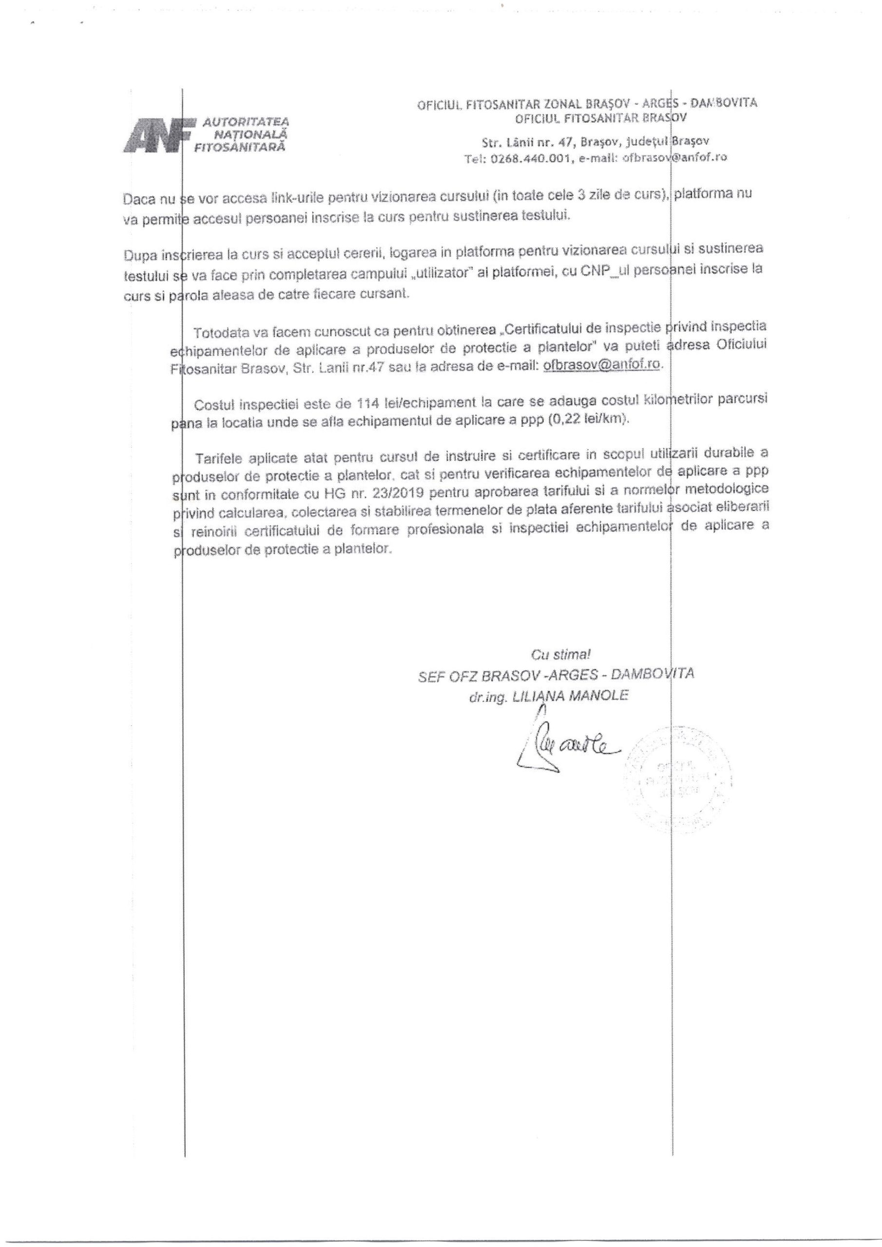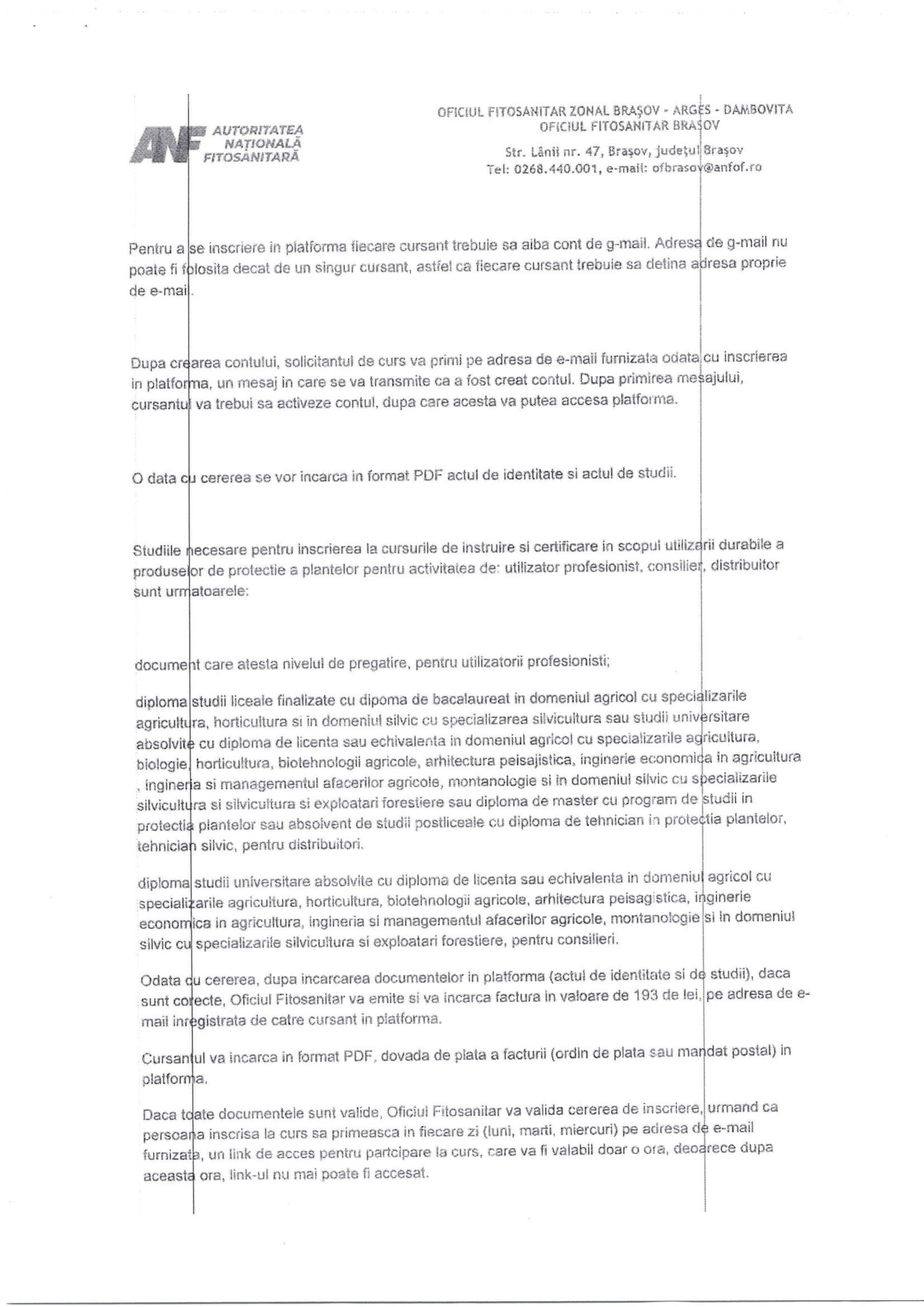 Informare: în anul 2026, Autoritatea Națională Fitosanitară prin Oficiul Fitosanitar Brașov, organizează doar on-line , cursuri de instruire și certificare în scopul utilizării durabile a produselor de protecție a plantelor pentru activitatea de utilizator profesionist, consilier, distribuitor.